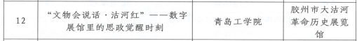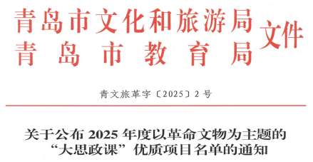近日,青岛市文化和旅游局、青岛市教育局联合印发了《关于公布2025年度以革命文物为主题的“大思政课”优质项目名单的通知》(青文旅革字〔2025〕2号)。经过单位推荐和专家评审,我们申报的《“文物会说话﹒沽河红”——数字展馆里的思政觉醒时刻》成功入选,荣获2025年度以革命文物为主题的“大思政课”优质项目。