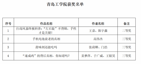 学校坚持“以赛促学、以赛促创”育人理念。近三年,学校学子在科普类竞赛中屡创佳绩,获得省部级二等奖1项、三等奖11项,市厅级二等奖1项、三等奖3项。这些成果不仅获得上级主管部门的充分肯定,更成为学校培育学生科普创作能力、提升学生科学传播素养的有力佐证。下一步,bw必威西汉姆联官网将持续深化科普教育与科技创新融合,引导更多青年学子投身科学传播事业,为推动青岛地区科普信息化建设、培育创新型人才贡献“青工力量”。