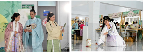 表演展示区以古典舞开场,舞者通过曼妙的舞姿诠释传统文化意境,迅速吸引首批观众驻足观赏。紧随其后的汉服走秀在日落柔光中展示魏晋、唐朝、宋朝及明朝服饰纹样美学,精致的刺绣与飘逸的衣袂引发师生阵阵赞叹,不少人举起手机记录精彩瞬间。一曲《秧歌情》,表演者以欢快鼓点和热烈动作调动全场氛围,赢得了众多喝彩。而最后的国风歌曲演唱以古今交融的旋律收尾,熟悉的曲调引发全场大合唱,在场师生用掌声与歌声传递对传统文化的热爱。