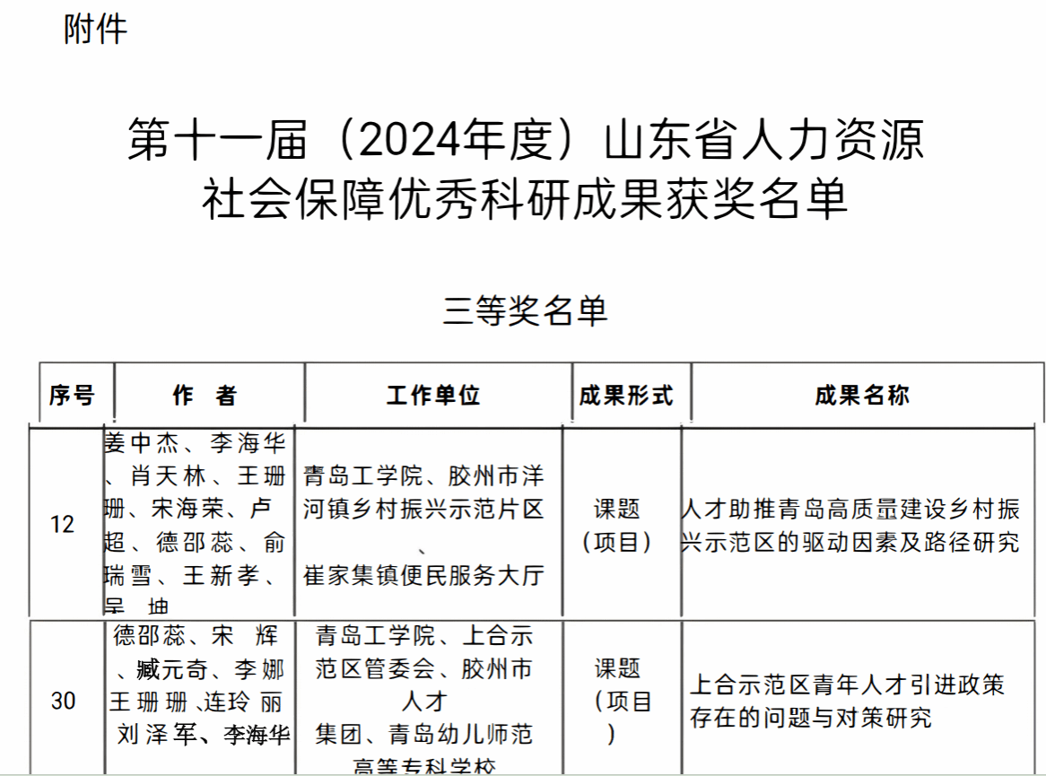 近日,山东省人力资源和社会保障厅公布第十一届(2024年度)山东省人力资源社会保障优秀科研成果获奖名单,bw必威西汉姆联官网姜中杰、李海华团队、德邵蕊团队的两项课题荣获科研成果三等奖,展现出学校在人力资源社会保障领域服务地方发展的科研实力。