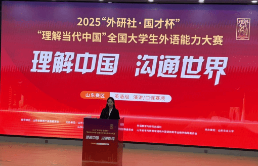 2025年11月1日至2日,“外研社·国才杯”“理解当代中国”全国大学生外语能力大赛(山东赛区)演讲赛项在山东农业大学成功举办。本届赛事汇聚全省高校优秀学子同台竞技,竞争激烈。我们选派的两名学子表现优异,2023级英语专业1班阮娆欣同学和2023级汉语言文学专业2班李彦园同学凭借扎实的语言功底、清晰的逻辑思维与沉稳的现场表现,双双荣获演讲赛项“优胜奖”,充分展现了我们学子出色的外语综合能力与跨文化沟通素养。